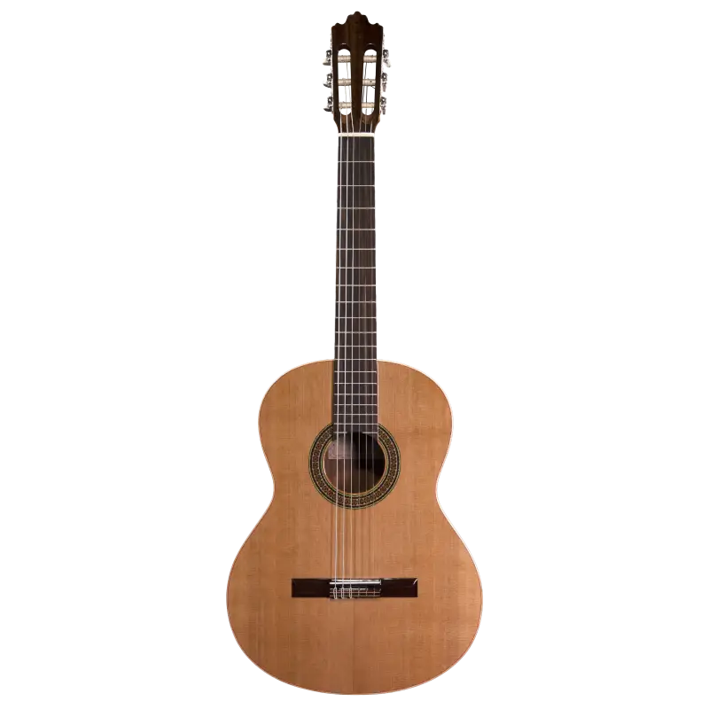 Wood selection: solid Canadian cedar top with a polished lacquer finish, double maple binding, and classic Iberian-style decorative detailing.